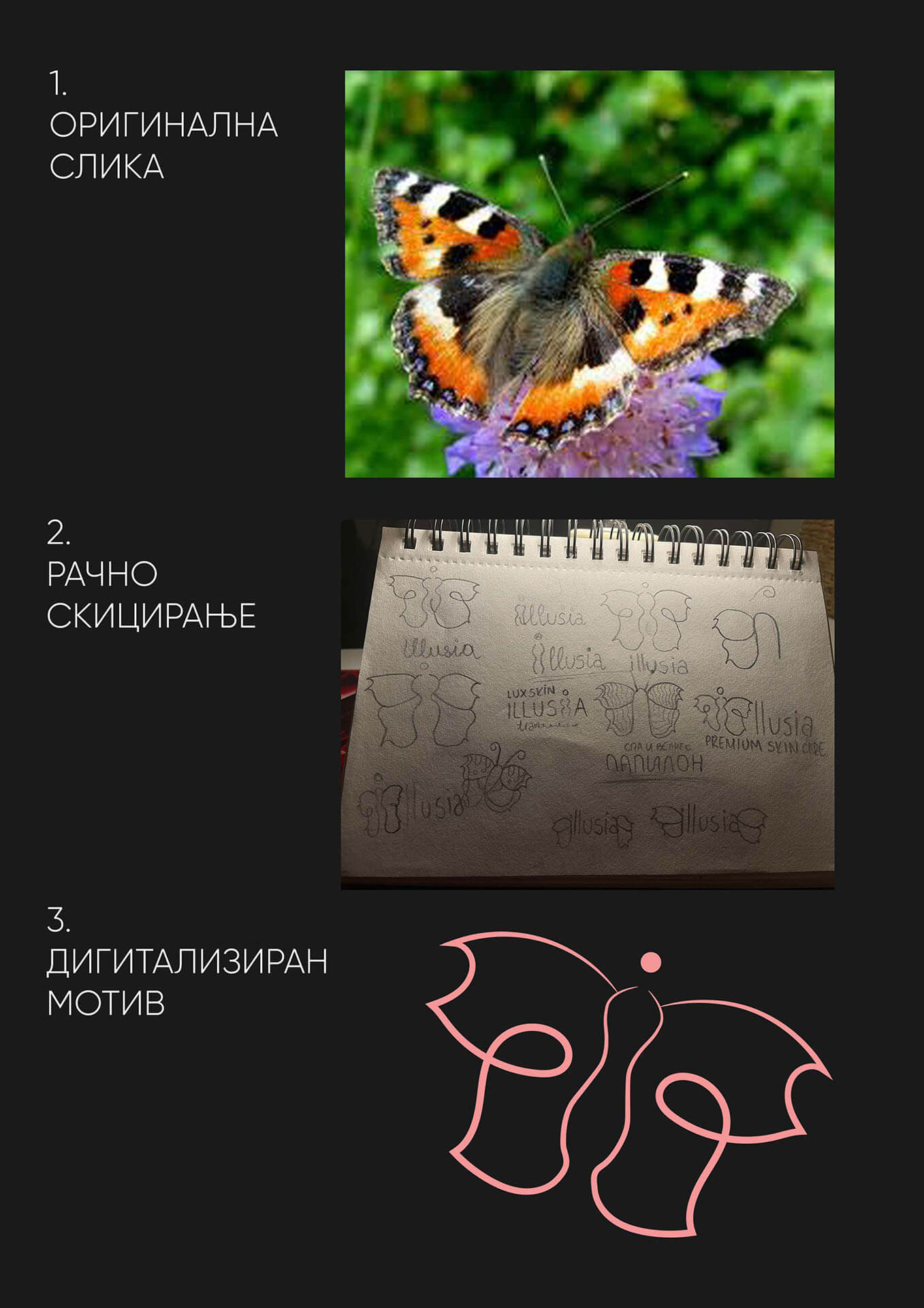 Инспирацијата произлезе од самата пеперутка – симбол на женственост, трансформација и елеганција. Таа идеја ме водеше низ целиот процес на создавање на Illusia – премиум бренд за нега на кожа и коса, наменет за жени.