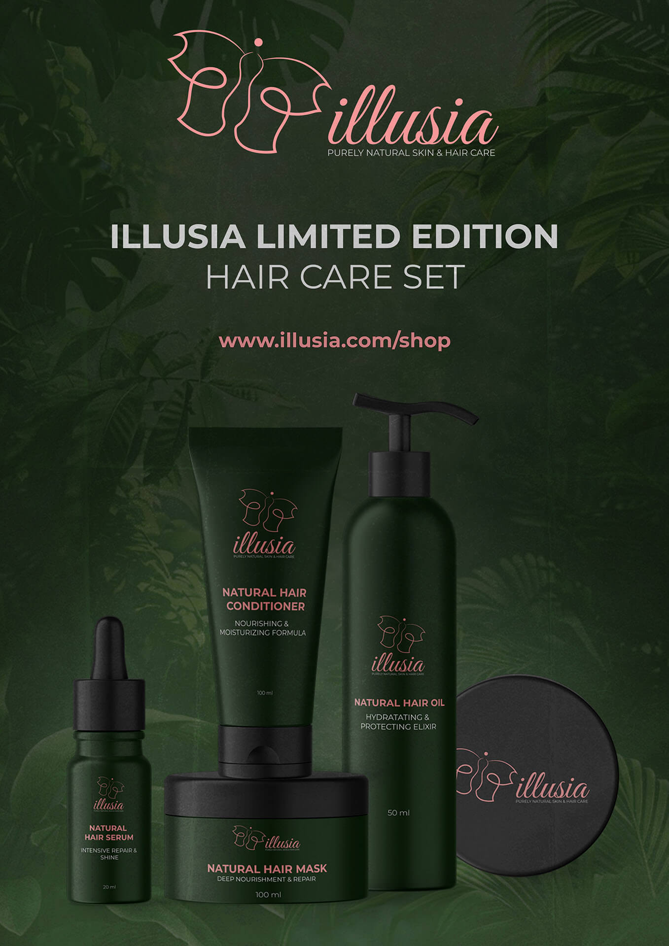 Лазар Петкоски – графичка стилизација на мотив и примена: Illusia – премиум бренд за нега на кожа и коса, наменет за жени.